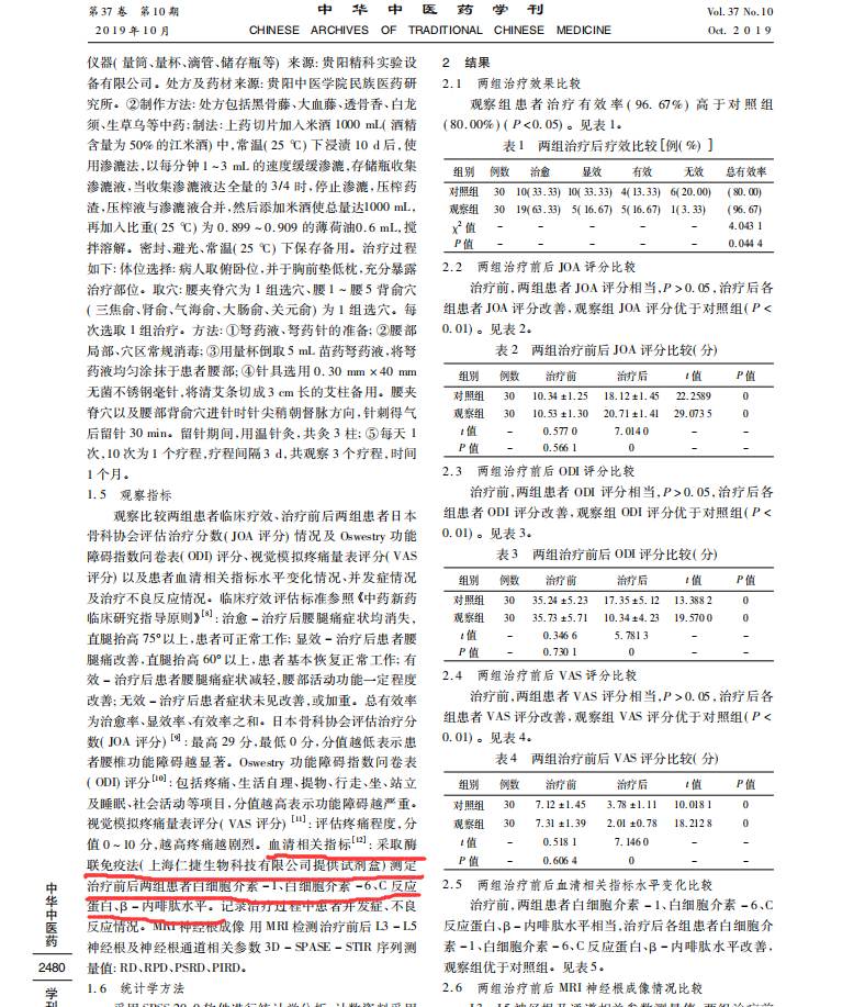 目的:探究苗醫弩藥液聯合溫針灸治療腰椎間盤突出癥(Lumbar Disc Herniation,LDH)臨床療效及安全性。方法:60例腰椎間盤突出癥患者采取隨機數字表法分組研究,根據治療方法不同分為觀察組與對照組,予以對照組患者(30例)隔姜灸聯合針刺治療,予以觀察組患者(30例)苗醫弩藥液聯合溫針灸治療,比較兩組患者臨床治療效果、治療前后兩組患者日本骨科協會評估治療分數(JOA評分)情況及Oswestry功能障礙指數問卷表(ODI)評分、視覺模擬疼痛量表評分(VAS評分)以及患者血清相關指標水平變化情況及其對MRI神經根成像的影響、并發癥情況及治療不良反應情況。結果:觀察組患者治療有效率(96.67%)高于對照組(80.00%),P<0.05;治療前,兩組患者JOA評分、ODI評分、VAS評分均相當(P>0.05),治療后各組患者JOA評分、ODI評分、VAS評分均改善,觀察組患者評分改善優于對照組(P<0.01);治療前,兩組患者血清白細胞介素-1、白細胞介素-6、C反應蛋白、β-內啡肽水平相當(P>0.05),治療后各組患者白細胞介素-1、白細胞介素-6、C反應蛋白、β-內啡肽水平均改善,觀察組優于對照組(P<0.05);觀察組治療前后RD、RPD、PSRD、PIRD有顯著性差異(P<0.05),兩組間比較有顯著性差異(P<0.05)。觀察組并發癥同對照組(3.33%),均較低(P>0.05);治療前后兩組患者見血、尿、肝、腎功能以及心電圖等均無異常變化,未見不良反應。結論:苗醫弩藥液聯合溫針灸治療腰椎間盤突出癥臨床療效顯著,患者癥狀改善,腰椎功能恢復良好,MRI神經根成像情況改善,且患者并發癥率低,未見不良反應,安全性高,值得臨床推廣以及應用。
